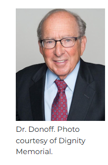 Dr. Donoff is survived by his wife of 61 years, Madelyn, and their children, Elizabeth and Daniel.